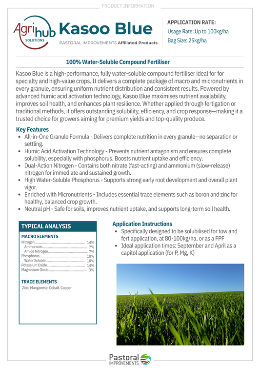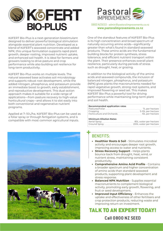 Regular price From $250.00Regular priceUnit price perSale price From $250.00KōFERT Bio-Base is a truly unique blend of organic New Zealand seaweeds, delivering naturally occurring bio-stimulants, amino acids, and multiple trace elements to enhance plant and soil vitality. Its base liquid seaweed formulation has been shown to improve the effectiveness of many modern herbicides and fungicides, while remaining residue-free. Suitable for use as both foliar and root feed, KōFERT Bio-Base can be seamlessly integrated into spray or irrigation programs, promoting healthier root systems, boosting nutrient uptake, and supporting overall soil biology—all with the benefit of naturally sourced nutrition.