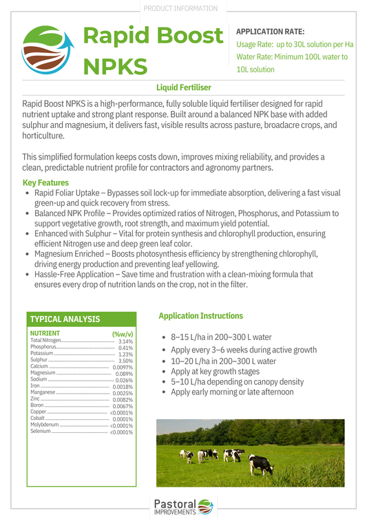 Rapid Boost NPKS is a high-performance, fully soluble liquid fertiliser designed for rapid nutrient uptake and fast plant response. Built around a balanced NPK base with added sulphur and magnesium, it delivers quick, visible results across pasture, broadacre crops, and horticulture.