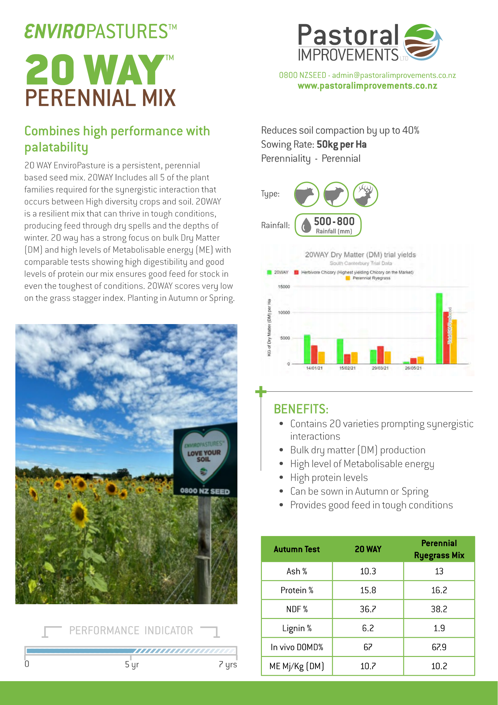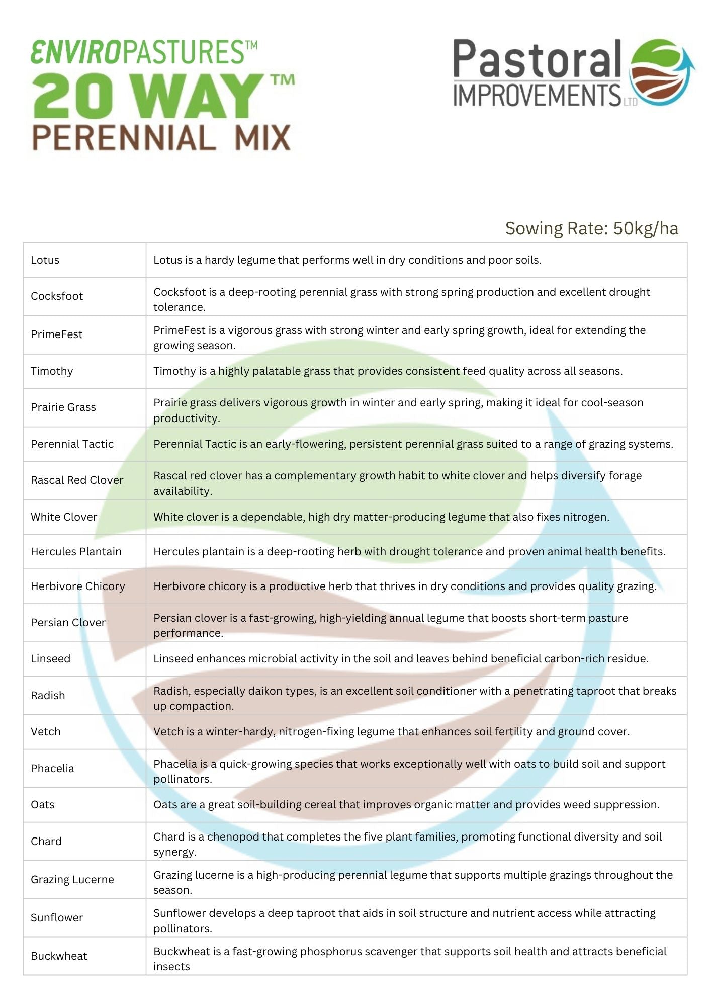 20 WAY is a highly diverse, persistent perennial-based seed mix, incorporating species from all five plant families to foster synergy between crops and soil. This resilient blend reliably produces feed under challenging conditions—performing consistently in both dry spells and winter months—while delivering excellent bulk Dry Matter (DM) and high Metabolisable Energy (ME). Its balanced composition and low grass staggers index enhance livestock health and productivity, making it suitable for both autumn and spring sowing.