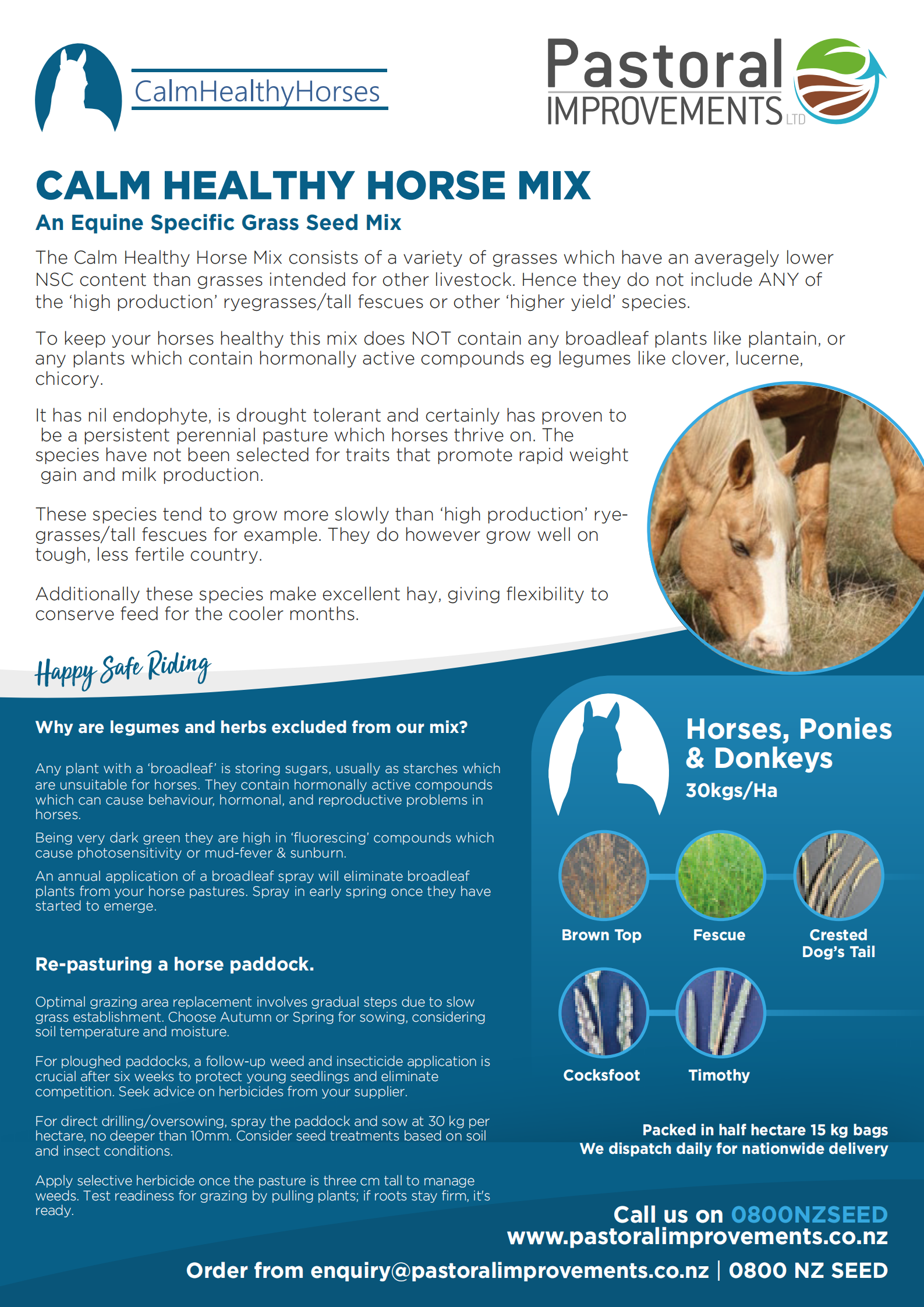 Formulated exclusively for horses, this carefully selected perennial pasture mix features lower-NSC grasses and excludes high-production ryegrasses, tall fescues, broadleaf plants, and legumes known to disrupt hormonal balance or cause excessive weight gain. With nil endophyte content, it provides safe, stagger-free grazing, ideal for laminitis-prone horses. Hardy and drought-tolerant, this slower-growing pasture is perfect for tough, less fertile conditions and makes excellent hay for flexible winter feed storage.