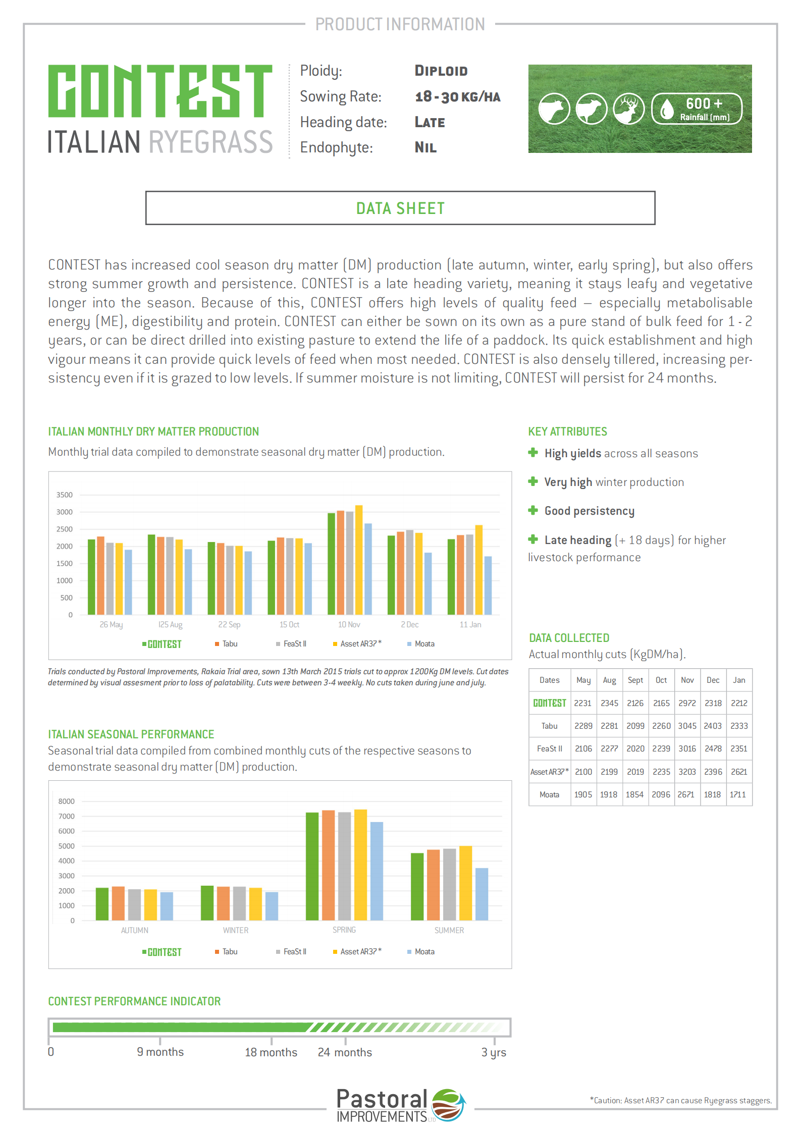 Contest is a late-heading Italian ryegrass with increased cool-season dry matter production (late autumn, winter, early spring) and strong summer growth, persisting up to 24 months when moisture is sufficient. Its later heading date keeps it leafy and high in ME, digestibility, and protein for a longer season, boosting animal performance. The dense tillering ensures quick establishment, good weed suppression, and the ability to withstand tight grazing.