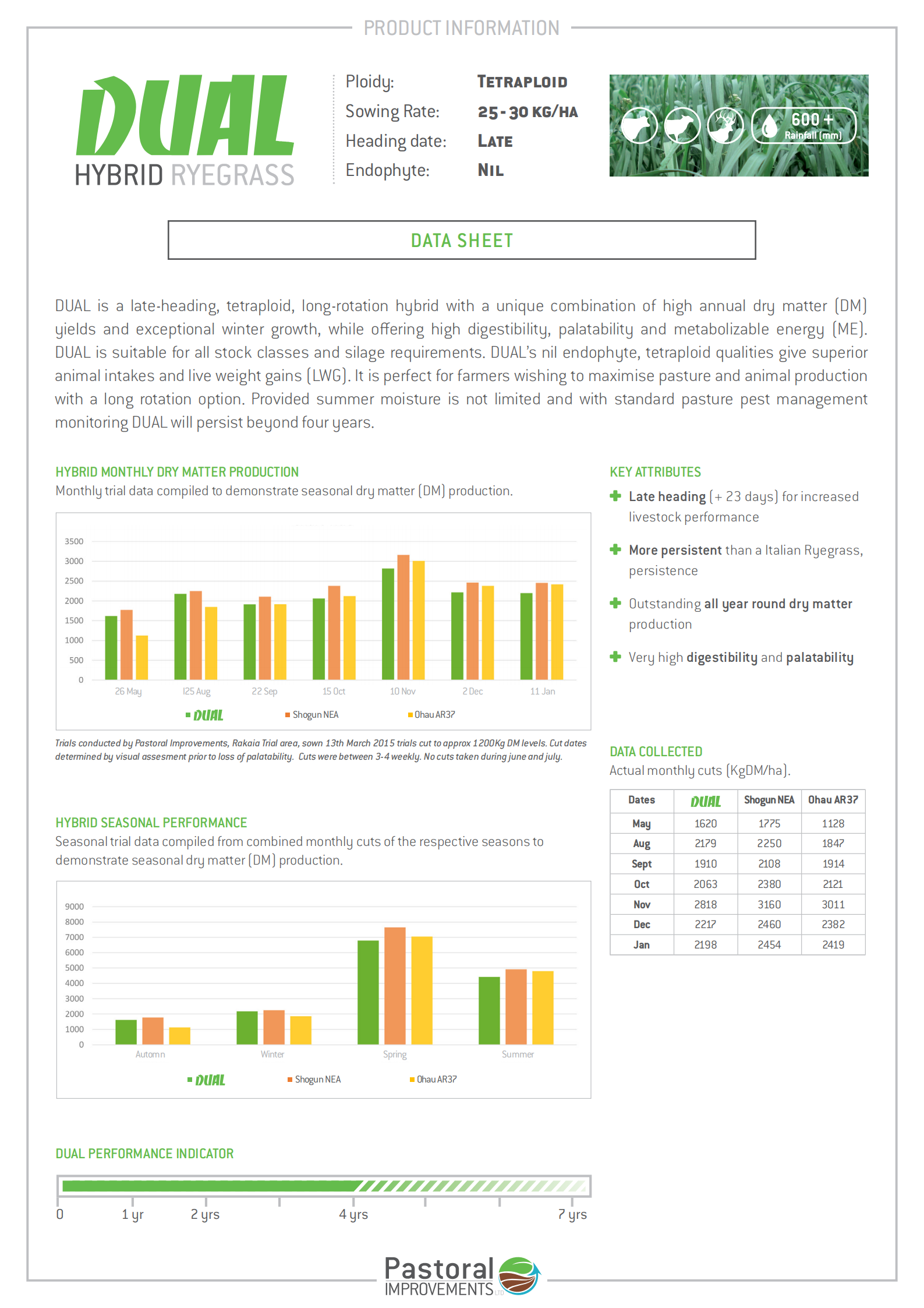 Dual is a late-heading, tetraploid, long-rotation hybrid (part Italian ryegrass, part perennial ryegrass) that excels in annual yield and winter growth while offering high digestibility and palatability. Its nil endophyte status and tetraploid nature support superior animal intakes and liveweight gains. With appropriate moisture and pest management, Dual can persist beyond four years, making it a great fit for farmers aiming to maximize pasture and animal production over the longer term.