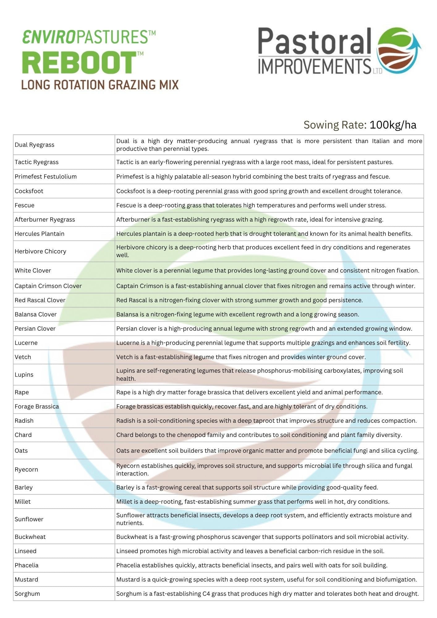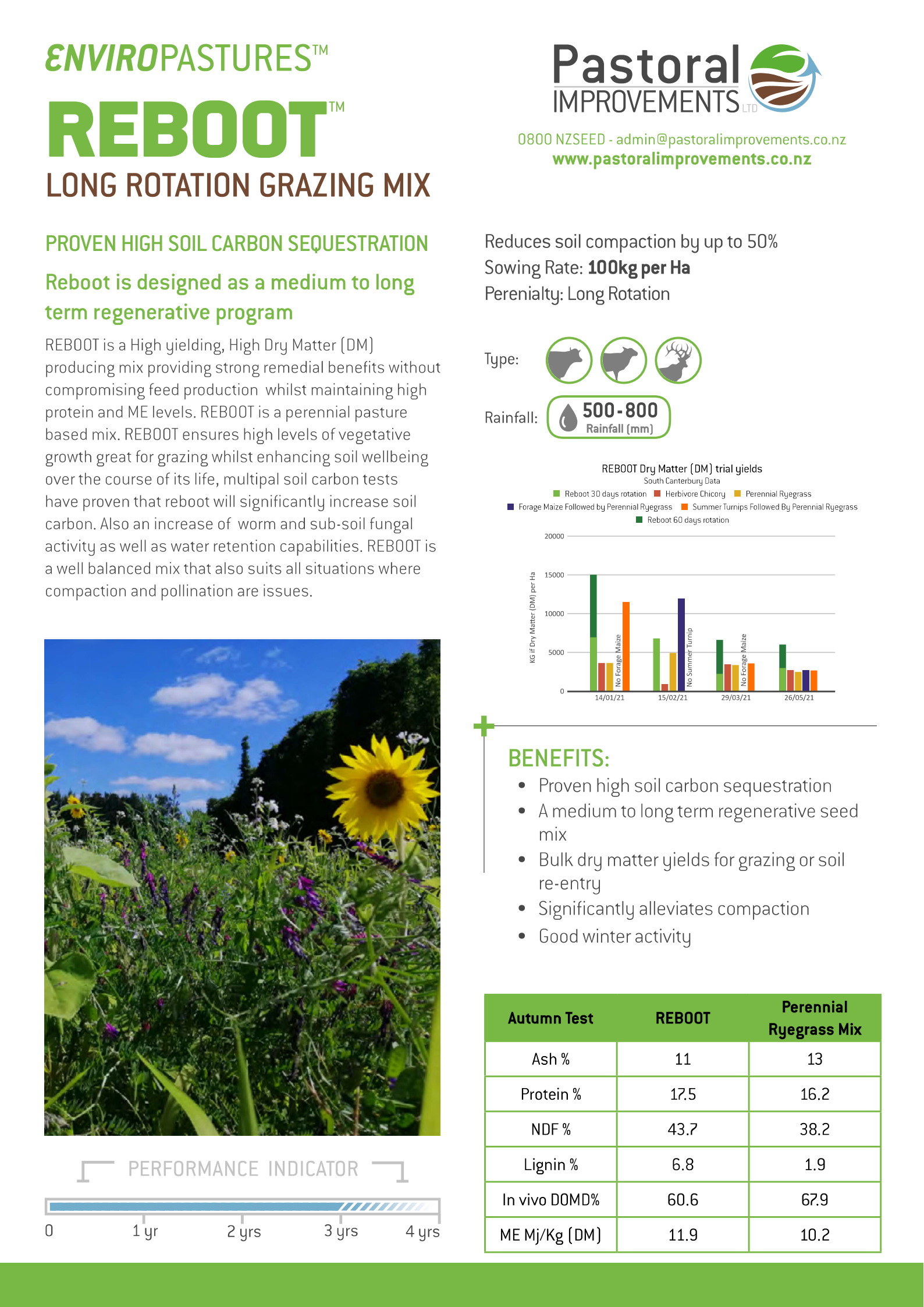 REBOOT is a high-yielding, perennial-based pasture mix designed to maximize feed production while actively improving soil health. Proven to significantly enhance soil carbon, stimulate worm and fungal activity, and improve water retention, REBOOT thrives where compaction or poor soil structure is a challenge. Its vigorous vegetative growth delivers exceptional protein content, high Metabolisable Energy (ME), and consistent overall pasture performance.