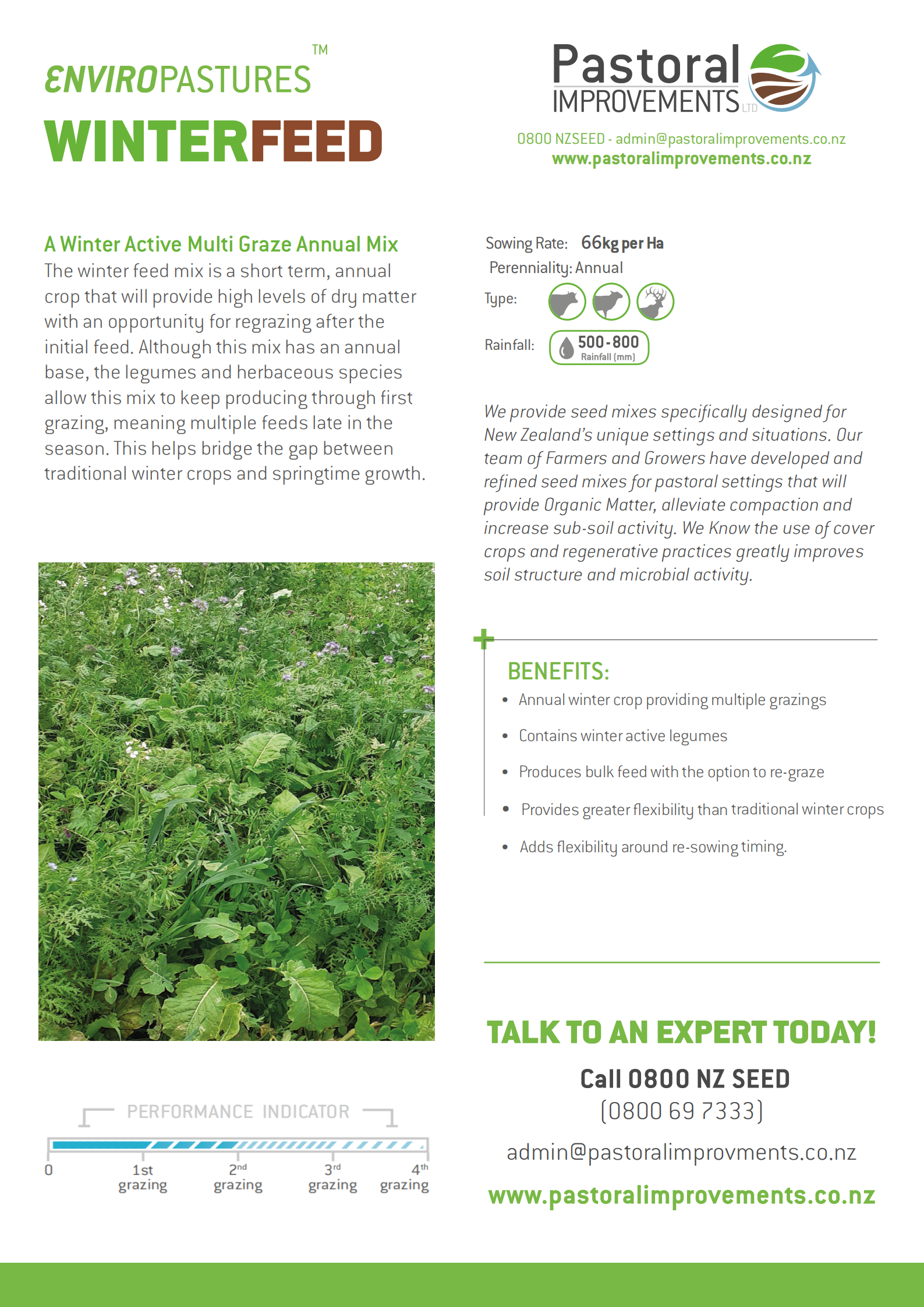 This short-term annual crop delivers high Dry Matter (DM) yields specifically designed for winter feeding, with potential for multiple grazings after the initial pass. The strategic inclusion of legumes and herbaceous species extends forage availability into the late season, bridging the feed gap until spring growth returns. This mix ensures consistent feed quality and provides essential soil benefits during times when traditional winter forage is scarce.